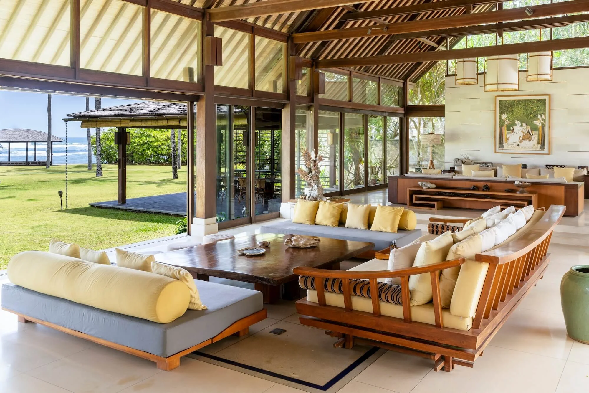 Konaditya House boasts expansive common areas designed for both relaxation and socializing. The spacious living room features large sofas and daybeds, seamlessly connecting to the open dining spaces that offer panoramic ocean views. Enjoy a leisurely morning by the breakfast pond or unwind in the elegant cigar room, where refined décor and comfortable seating create the ideal ambiance for intimate gatherings. Every shared space is thoughtfully curated to enhance your experience of serene luxury.